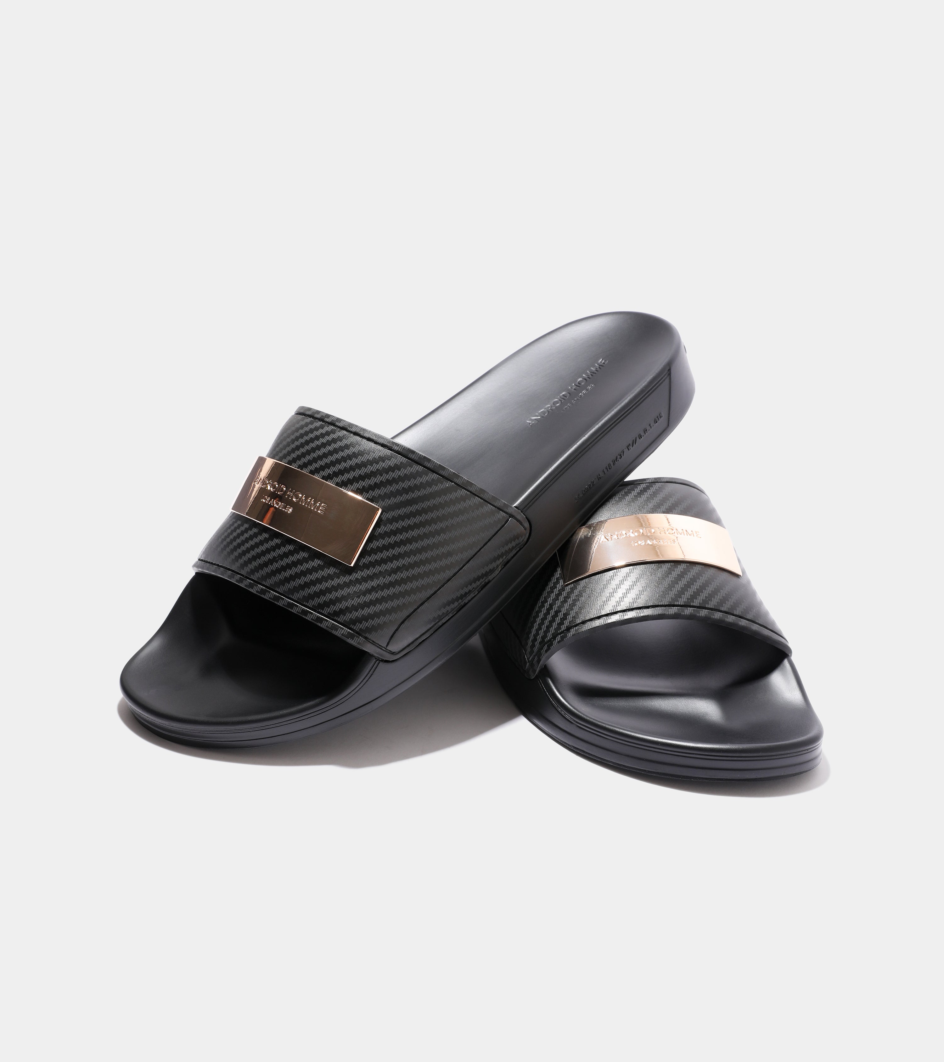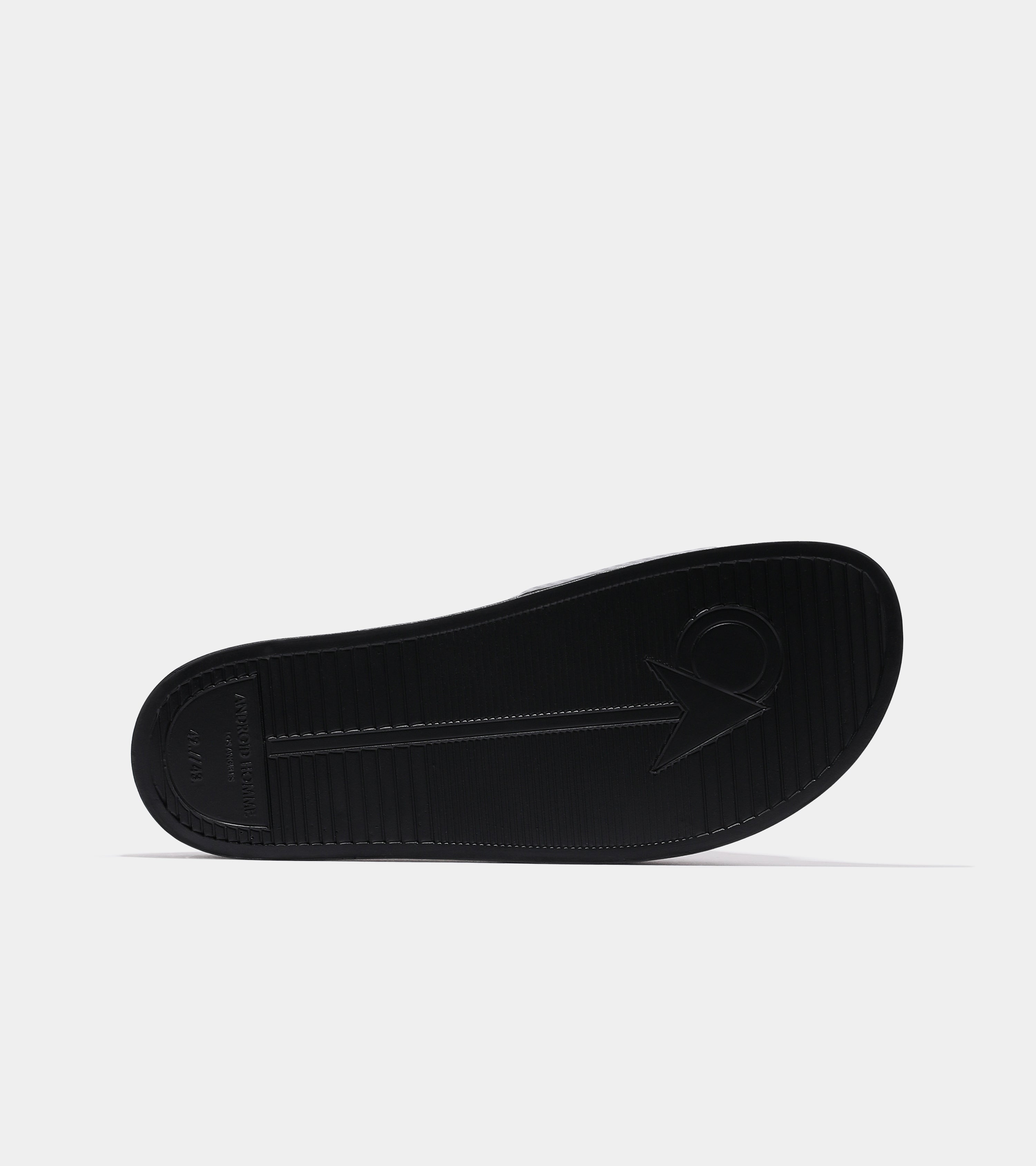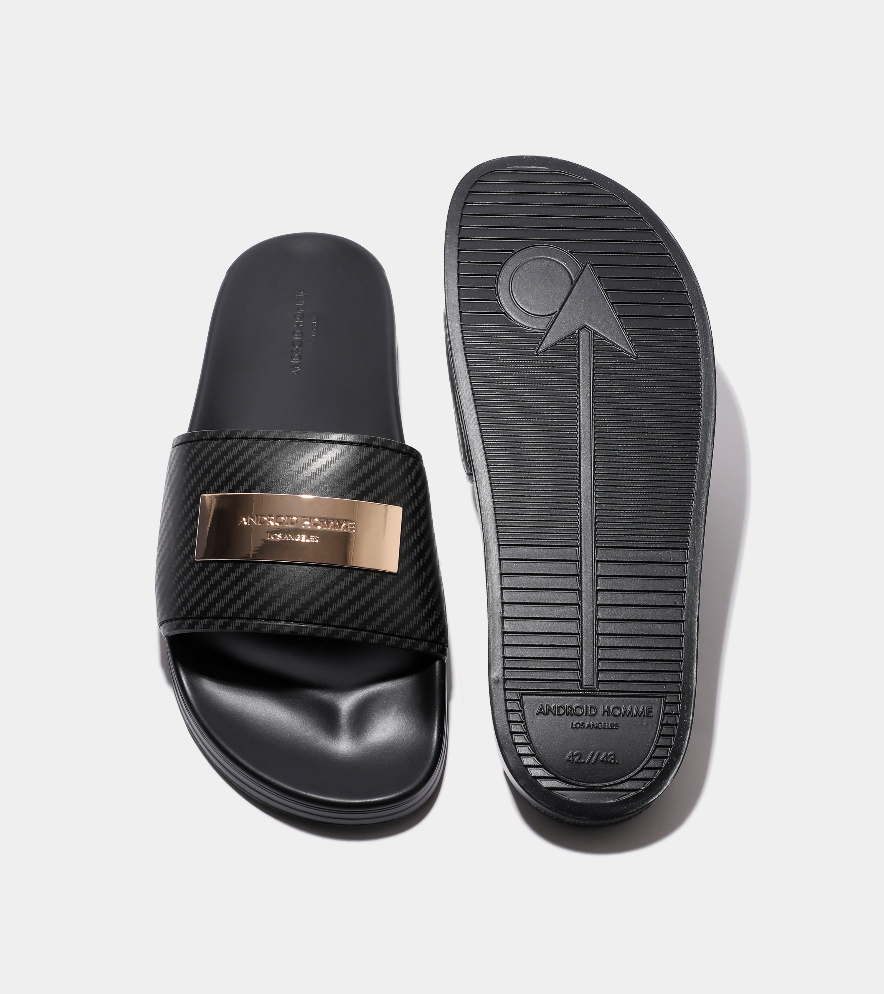 The Laguna Beach Slides deliver a relaxed rubber comfort slide with a minimalist look, elevated by a gold nickel metal logo plate inspired by Android Homme's signature design, perfect for effortless style. A tonal cushioned lining beneath the band enhances comfort for all‑day wear.
