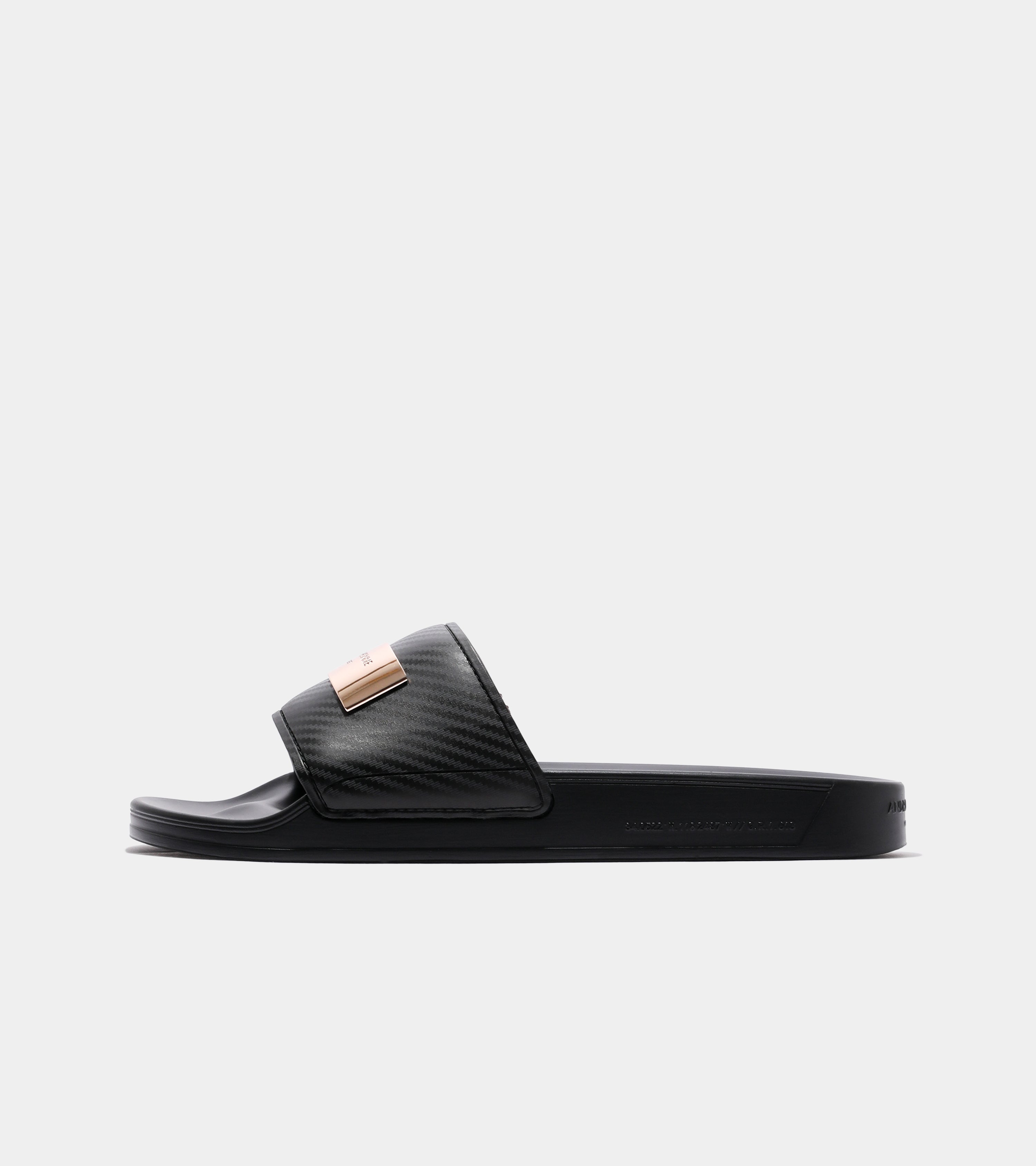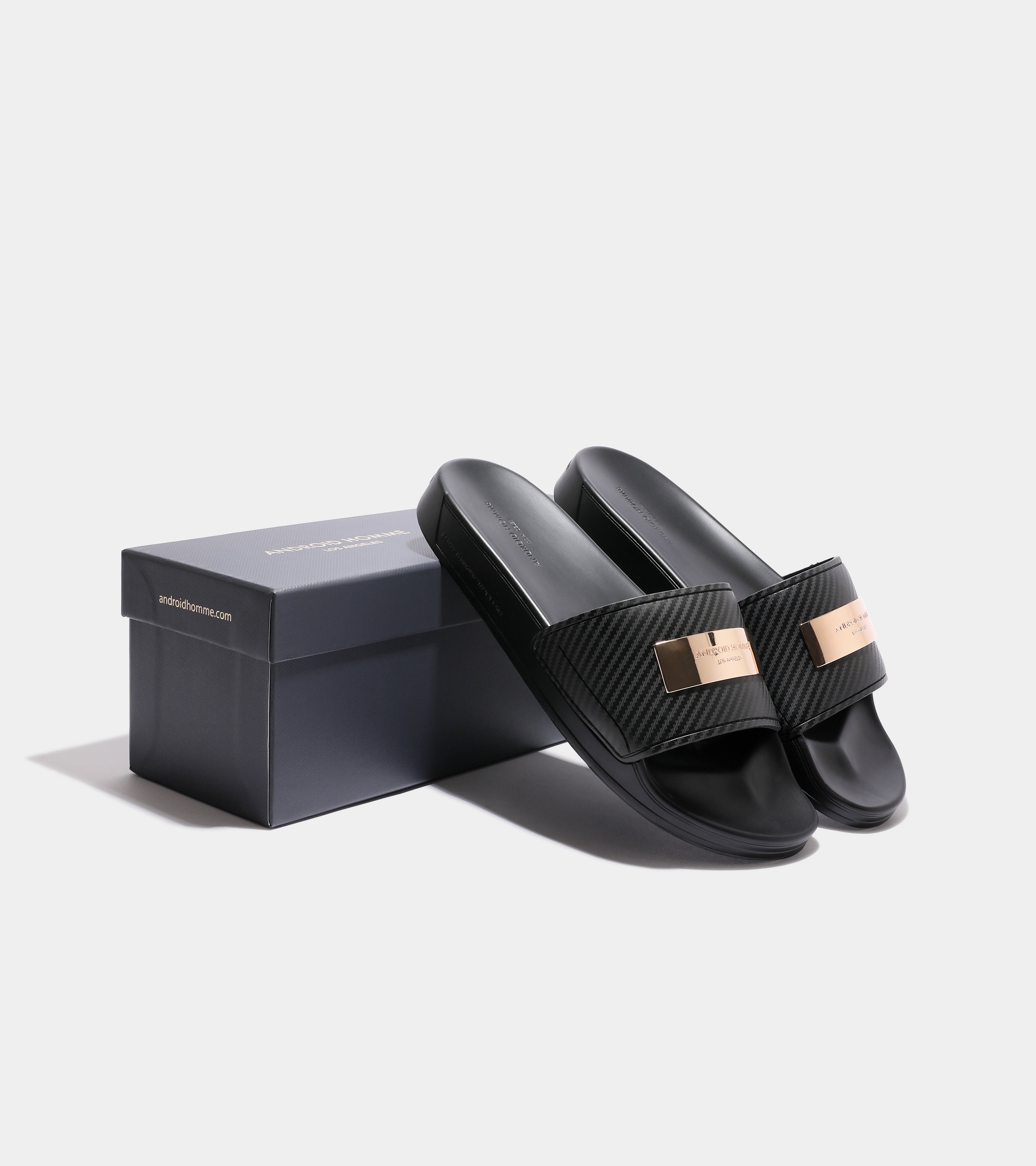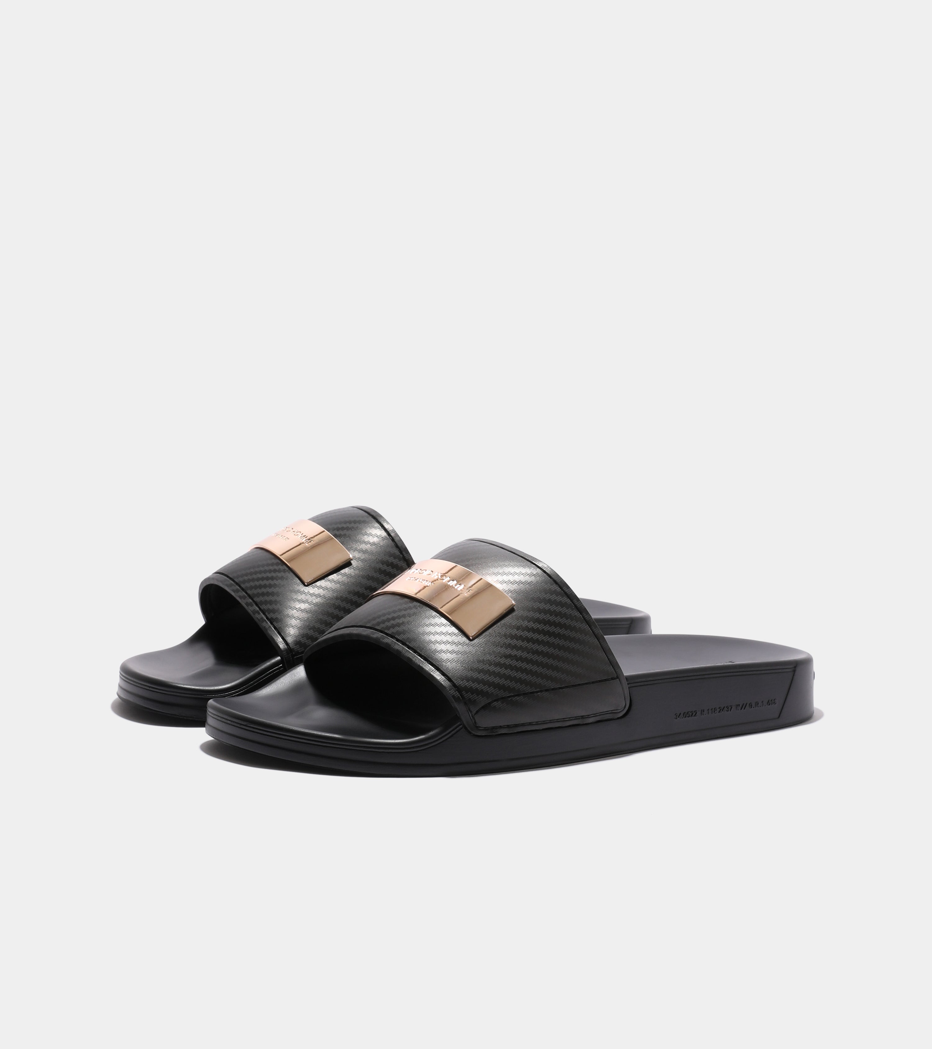 The Laguna Beach Slides deliver a relaxed rubber comfort slide with a minimalist look, elevated by a gold nickel metal logo plate inspired by Android Homme's signature design, perfect for effortless style. A tonal cushioned lining beneath the band enhances comfort for all‑day wear.