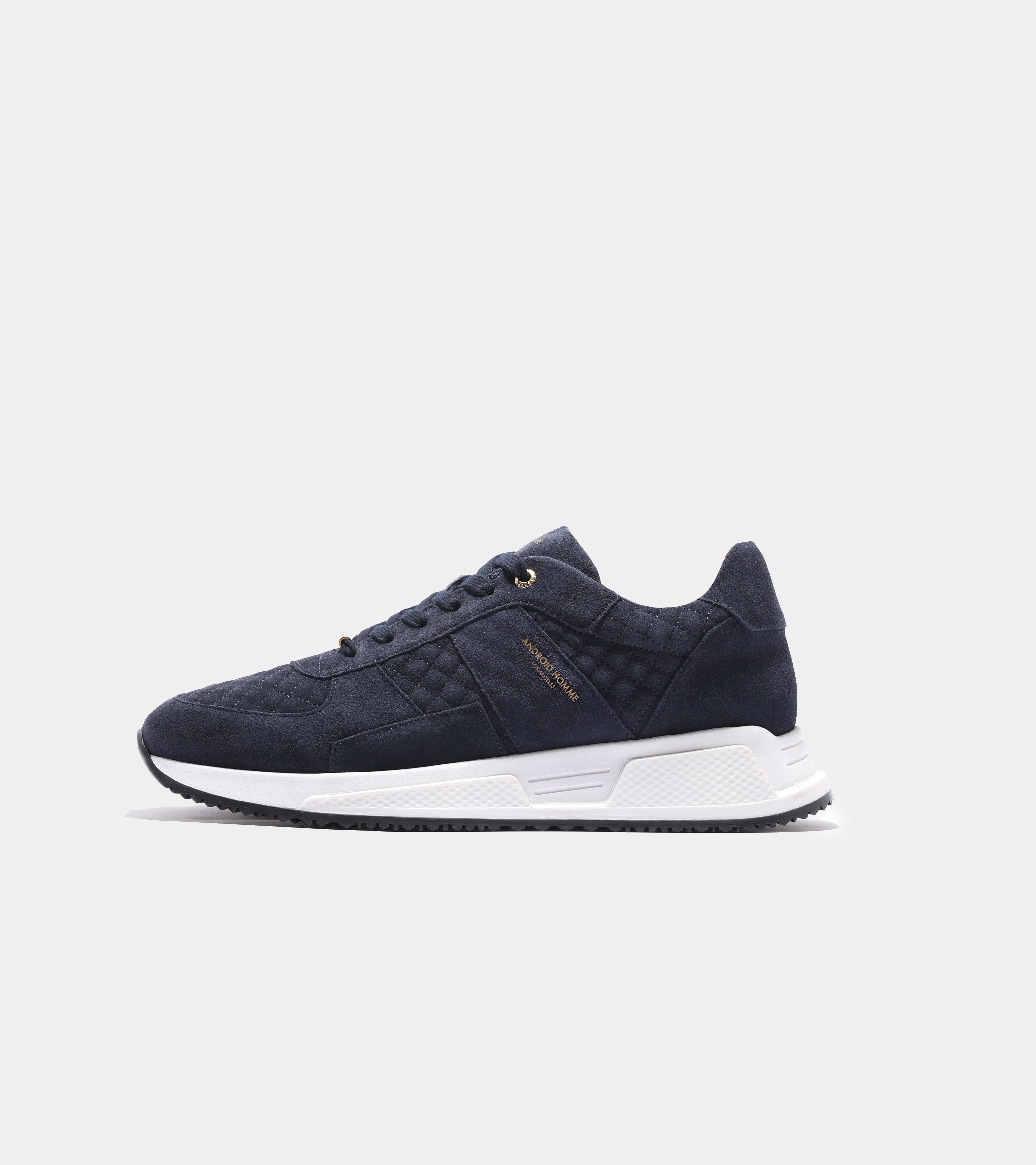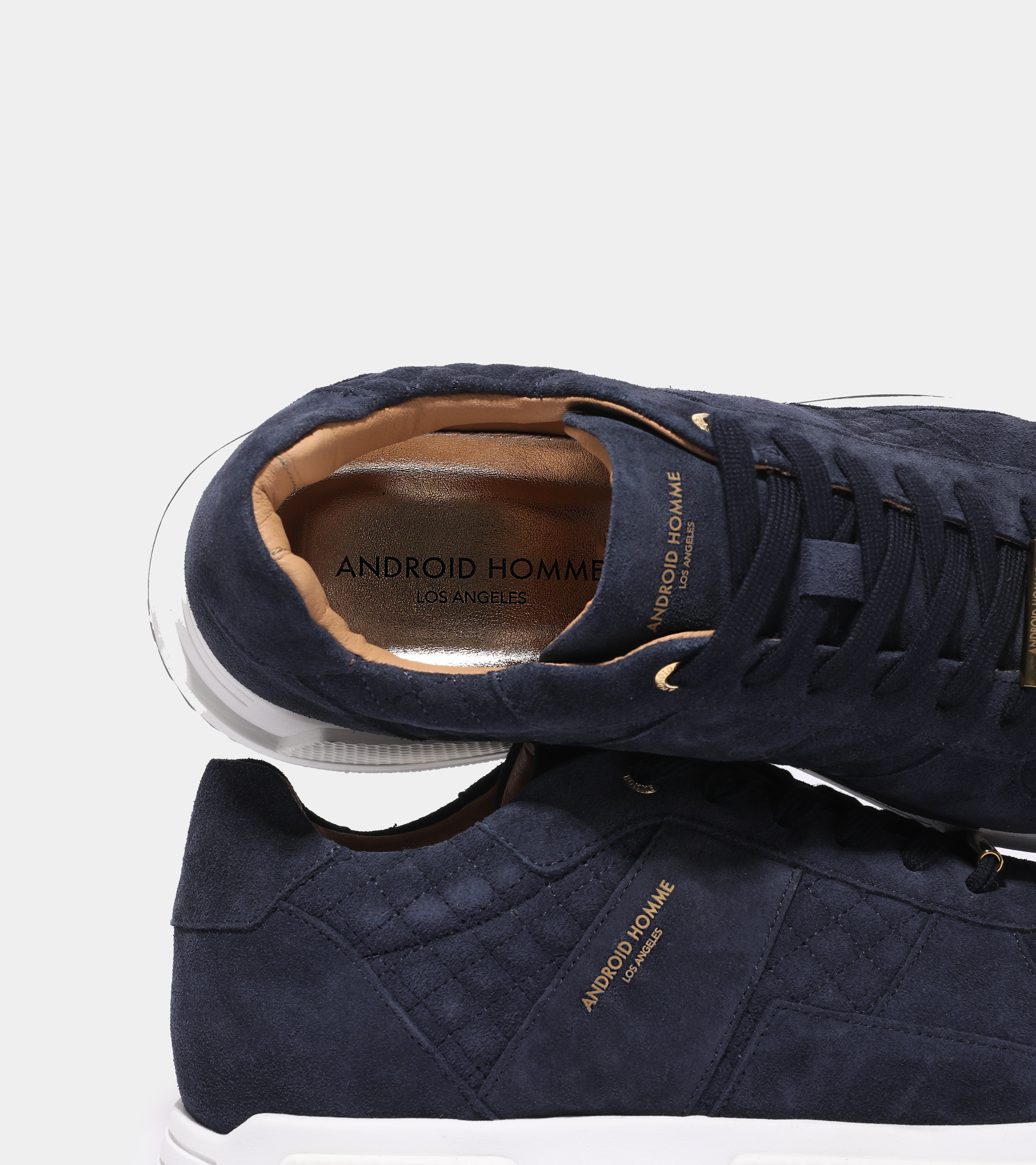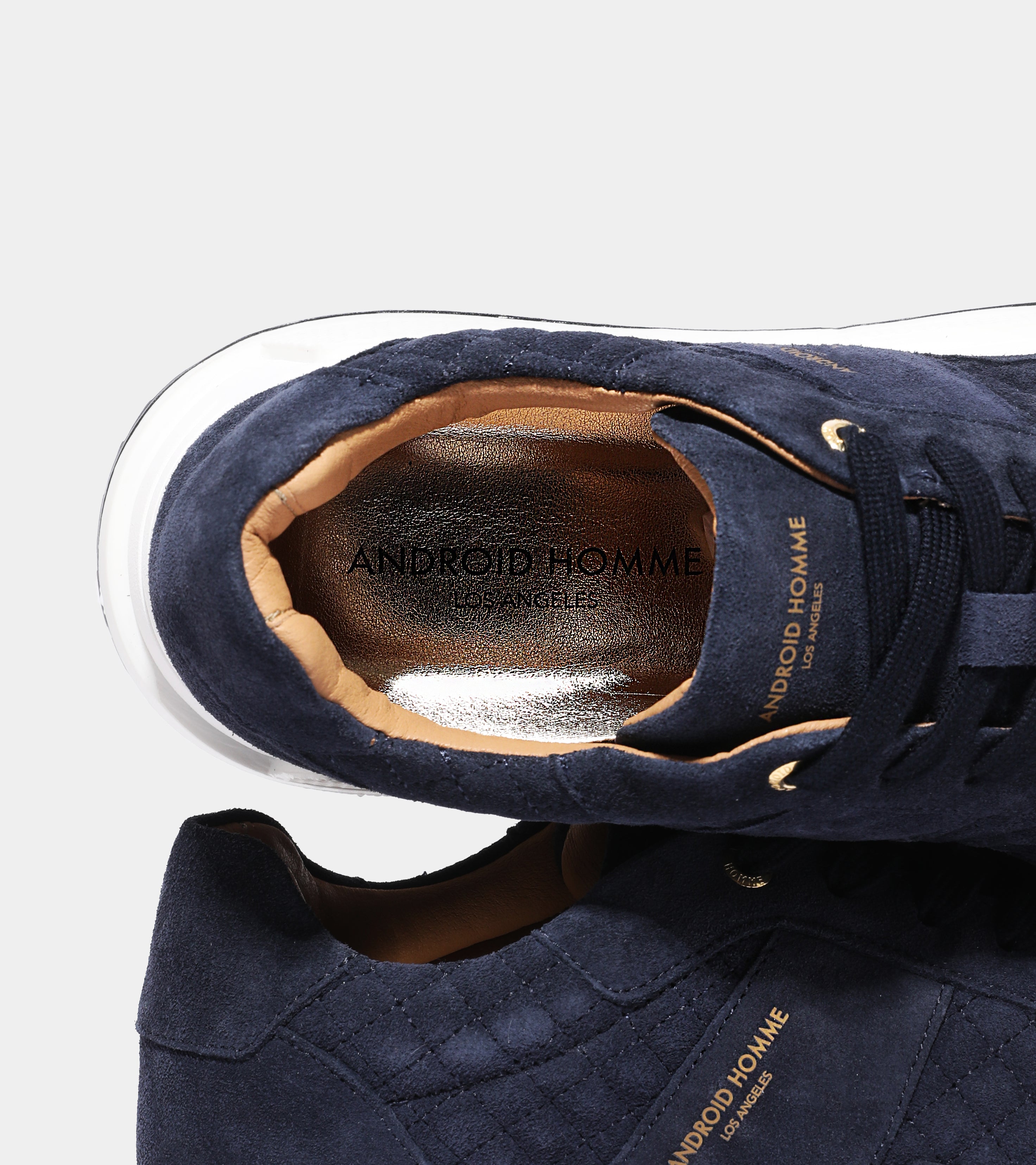 This sophisticated silhouette evolves with a full navy suede upper featuring quilted stitch‑panel detailing, bringing a rich tactile dimension to the iconic Matador profile. Crafted from Leather Working Group–certified Spanish suede, the construction delivers elevated texture and responsible sourcing. A tubular gold brass lace detail, laser‑engraved with the signature logo, introduces a refined metallic contrast.