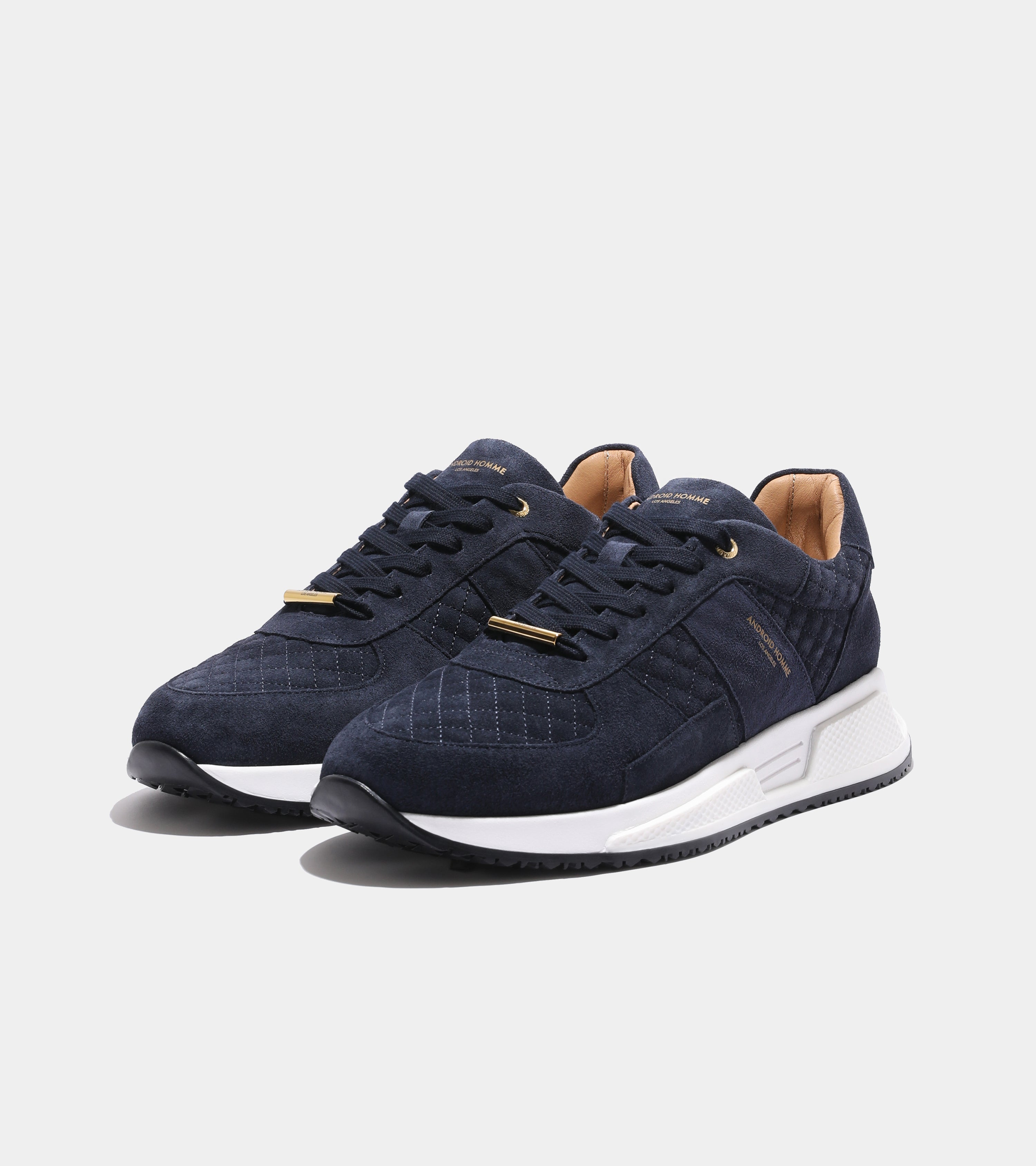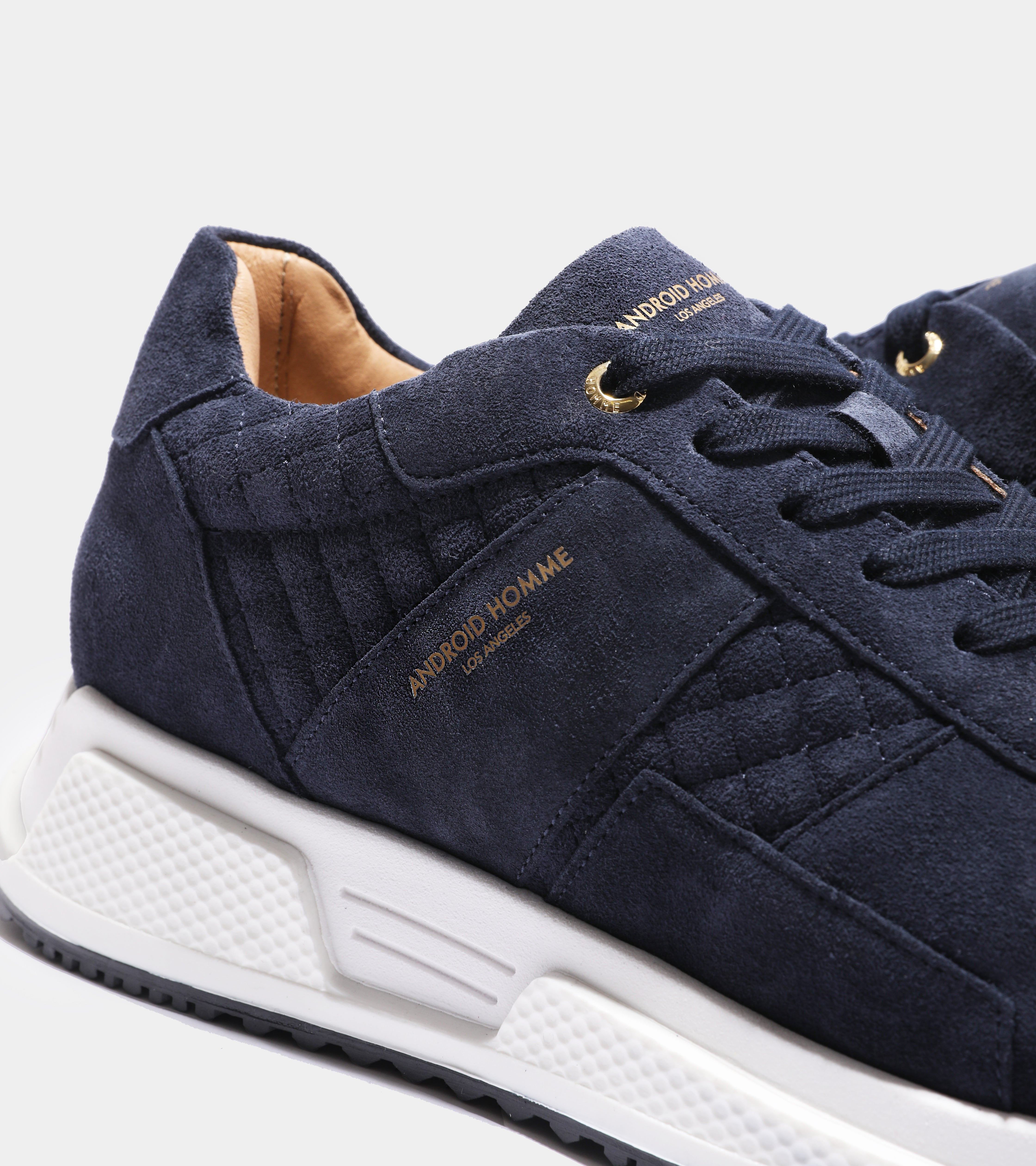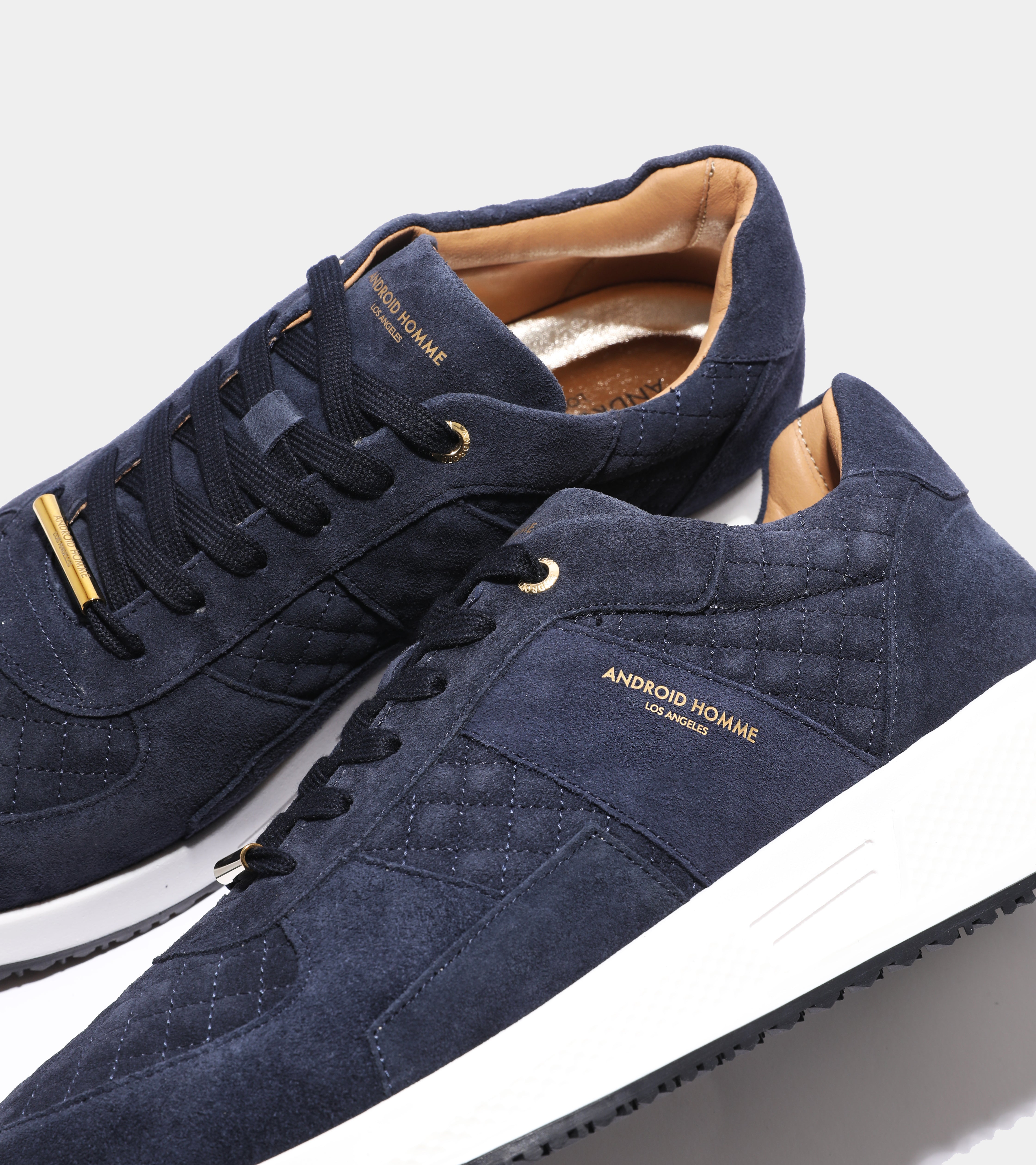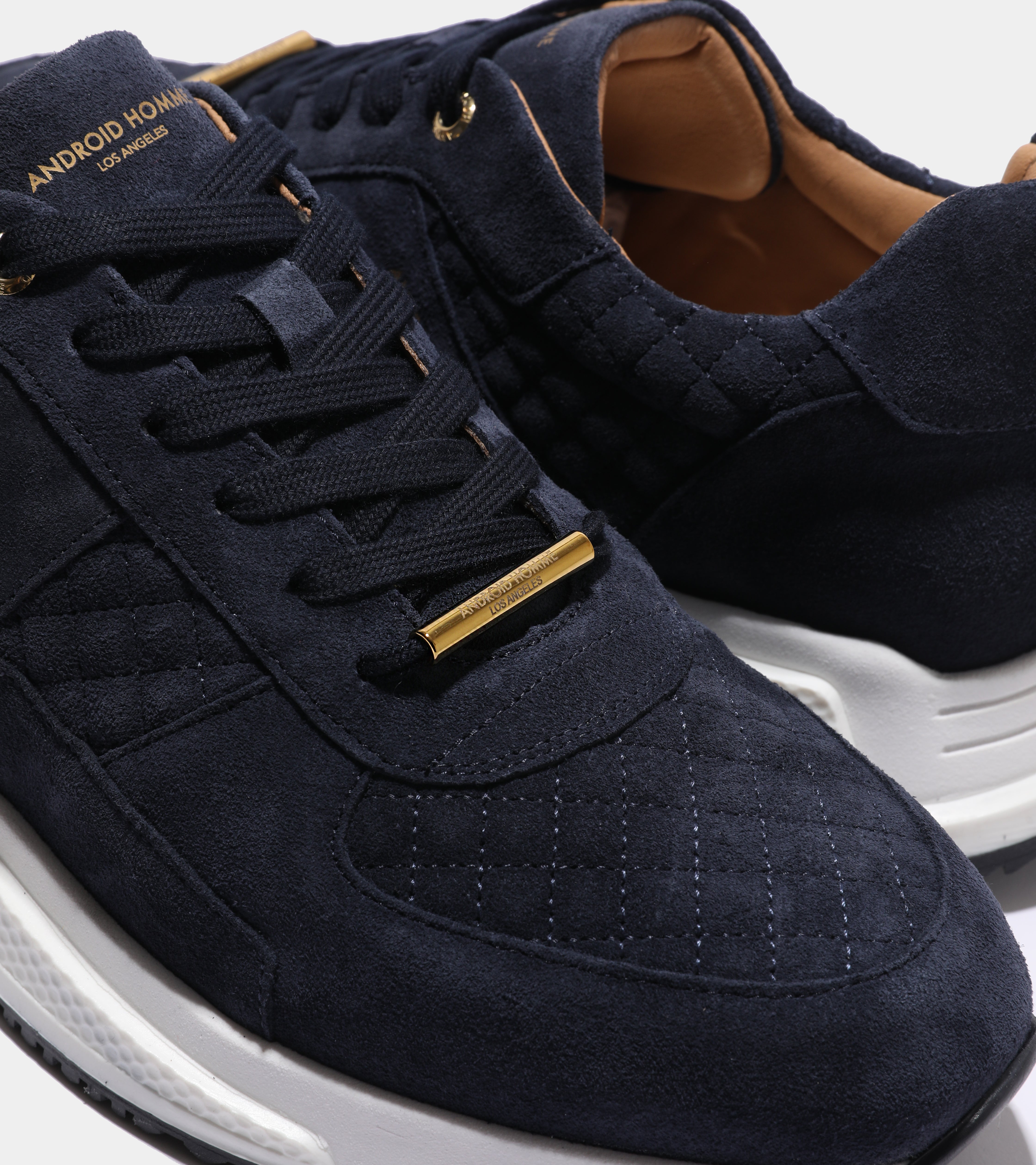 This sophisticated silhouette evolves with a full navy suede upper featuring quilted stitch‑panel detailing, bringing a rich tactile dimension to the iconic Matador profile. Crafted from Leather Working Group–certified Spanish suede, the construction delivers elevated texture and responsible sourcing. A tubular gold brass lace detail, laser‑engraved with the signature logo, introduces a refined metallic contrast.